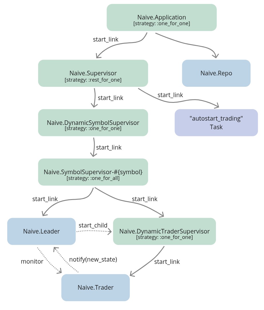Naive.Traderprocesses to finish their ongoing trades. To be able to do that we will need to inform theNaive.Leaderprocess assigned to the symbol that the settings for that symbol have been updated and that should cause theNaive.Leaderprocess to withhold starting newNaive.Traderprocesses and terminate the whole tree when the last trader will finish. - autostart trading - this will be a very similar implementation to the one from the last chapter. It will require introducing a new supervisor(we will follow the same naming convention: rename